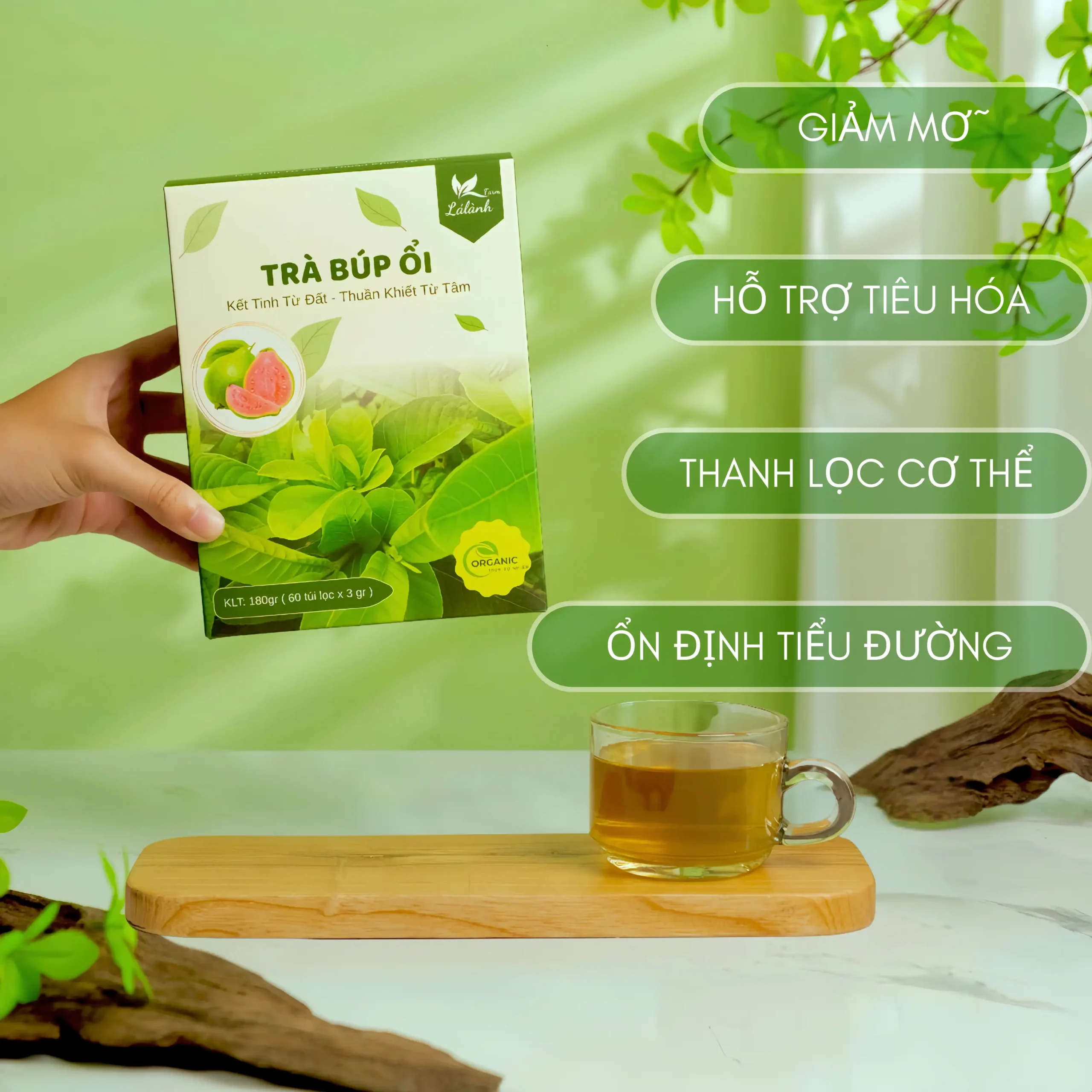 Trà Búp Ổi Lá Lành Farm được làm từ 100% búp ổi non hữu cơ, hương vị thanh mát dịu ngọt, hoàn toàn tự nhiên, KHÔNG chất bảo quản, KHÔNG phẩm màu, KHÔNG hương liệu. Sản phẩm giúp hỗ giảm mỡ, giảm cân, cải thiện vóc dáng, hỗ trợ tiêu hóa, cân bằng đường huyết, huyết áp, mẫu nhiễm mỡ,… và tăng cường sức đề kháng. Quy cách hộp 180g gồm 60 túi lọc tiện lợi, dễ sử dụng mỗi ngày