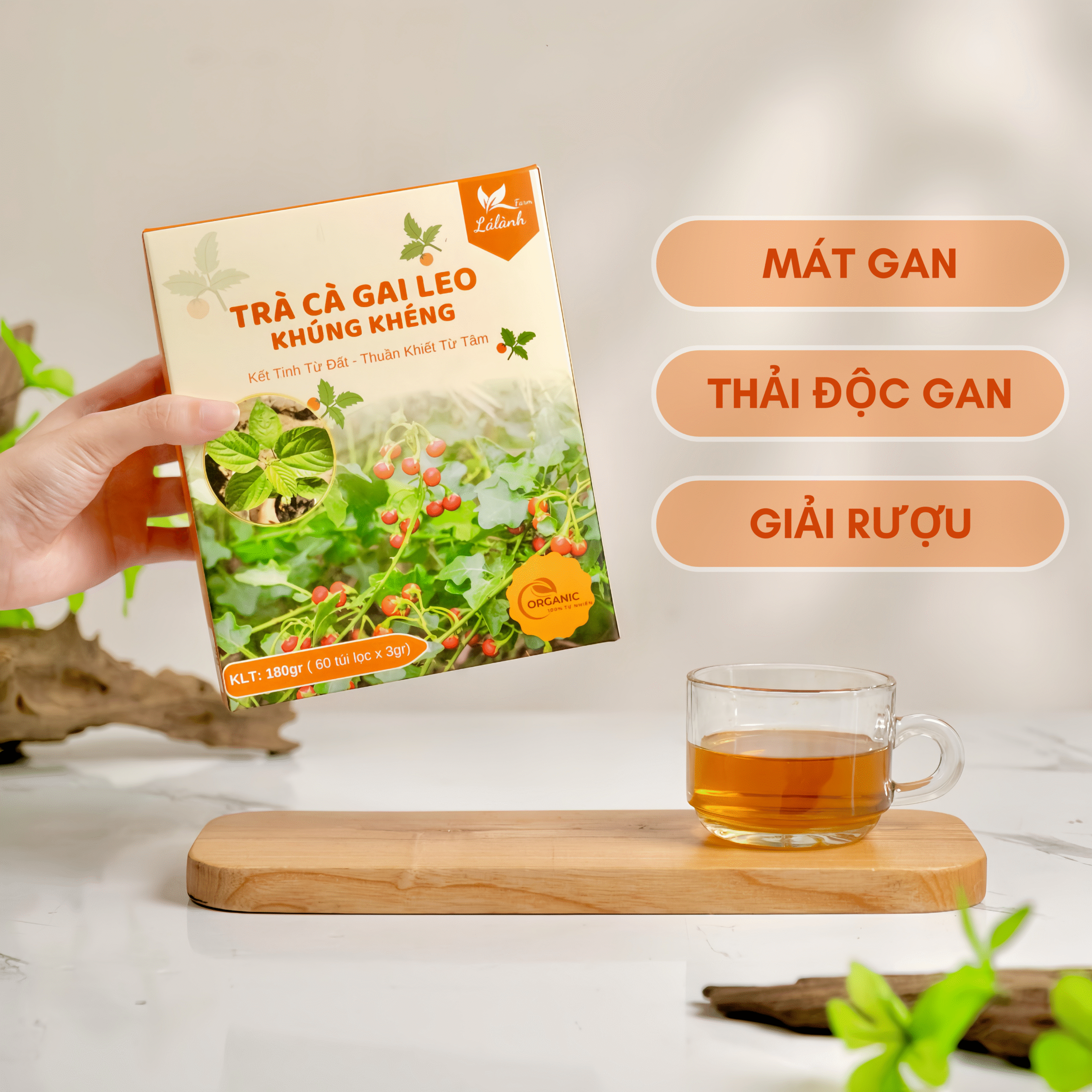 Nếu bạn đang muốn tìm một sản phẩm không chỉ thư giãn, thơm ngon, mà còn tốt cho sức khỏe thì Trà Cà gai leo Khúng khéng của Lá Lành Farm là lựa tuyệt vời cho sức khỏe. Vì không chỉ là một sản phẩm hỗ trợ cải thiện các vấn đề về gan, tăng cường chức năng gan, mà đặc biệt còn có thể giải rượu cực kỳ nhanh chóng. Bí kíp bỏ túi cho các anh thường xuyên phải tiếp khách, nhậu nhẹt, bia rượu. Hộp trà 180g (60 túi x 3g) tiện lợi mang theo bên mình, đi bất cứ đâu, có thể sử dụng trong vòng 1 tháng.